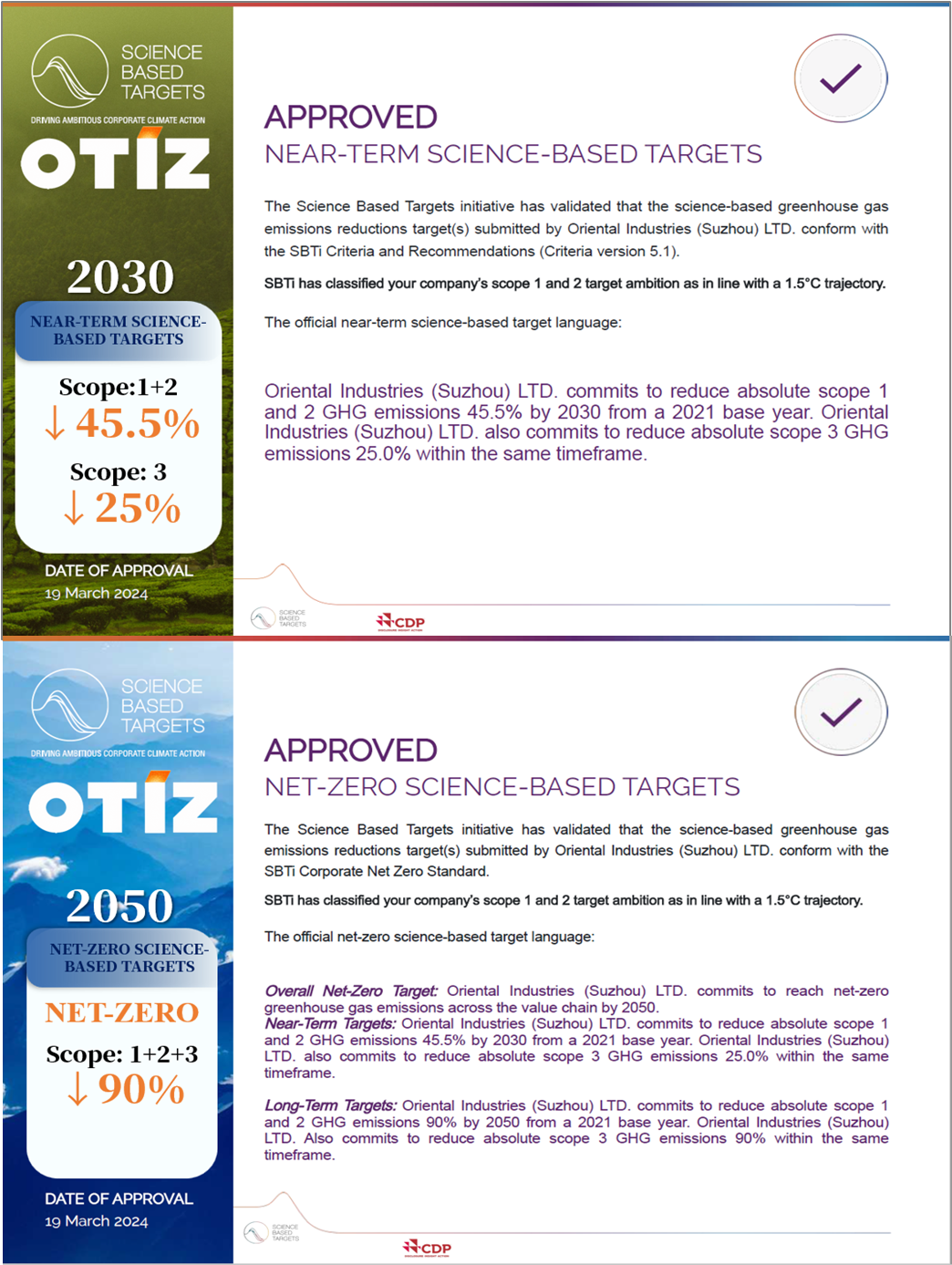 OTIZは溫室効果ガスの排出削減に努めており、ISO 14064-2018(溫室効果ガスインベントリ)または地域の基準條例に従って溫室効果ガスのインベントリおよび計算を?qū)g施しています。SBTi科學的炭素目標およびCDP炭素開示を通じて、溫室効果ガス排出削減への決意を表明しています。生産効率の向上、高効率機器の導入、太陽光発電、再生可能エネルギーの使用などを通じてエネルギーを節(jié)約し、二酸化炭素排出量の削減と生産活動が環(huán)境に與える影響の軽減を目指しています。